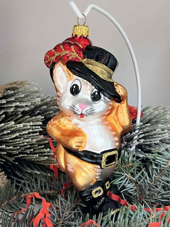 Urocza bombka szklana przedstawiająca znanego bohatera bajki – Kota w Butach. Ręcznie malowana z niezwykłą dbałością o szczegóły, zachwyca intensywnymi kolorami, błyszczącymi elementami i delikatnymi zdobieniami brokatem. To wyjątkowa ozdoba choinkowa, która doda bajkowego charakteru każdemu świątecznemu drzewku.