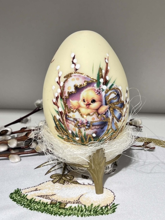 • Jaja wielkanocne ze szkła wysokośc około 14 cm,podstawka w zestawie.Czasem motyw może się nieznacznie różnić