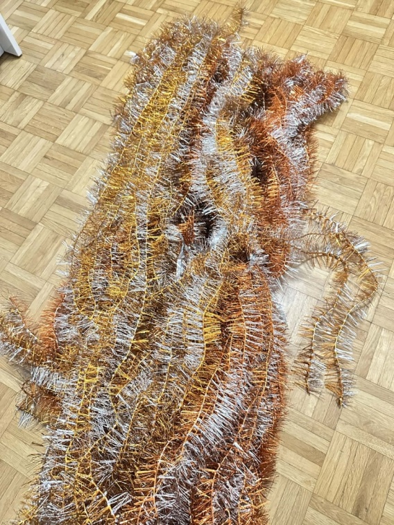 Łańcuch wykonany z klasycznej metalizowanej taśmy dekoracyjnej w kolorach złota, miedzi i srebra, typowych dla świątecznych ozdób z lat 70. i 80. XX wieku. To dokładnie ten sam rodzaj dekoracji, który zdobił choinki w polskich domach w czasach PRL.