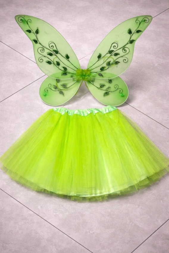Bajkowy strój motylka idealny na bal przebierańców, przedstawienie szkolne lub urodziny. Intensywnie zielona spódniczka i kolorowe skrzydła tworzą efektowną, wiosenną stylizację.